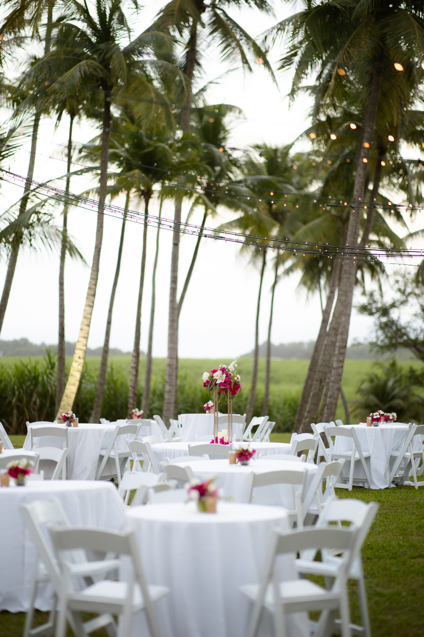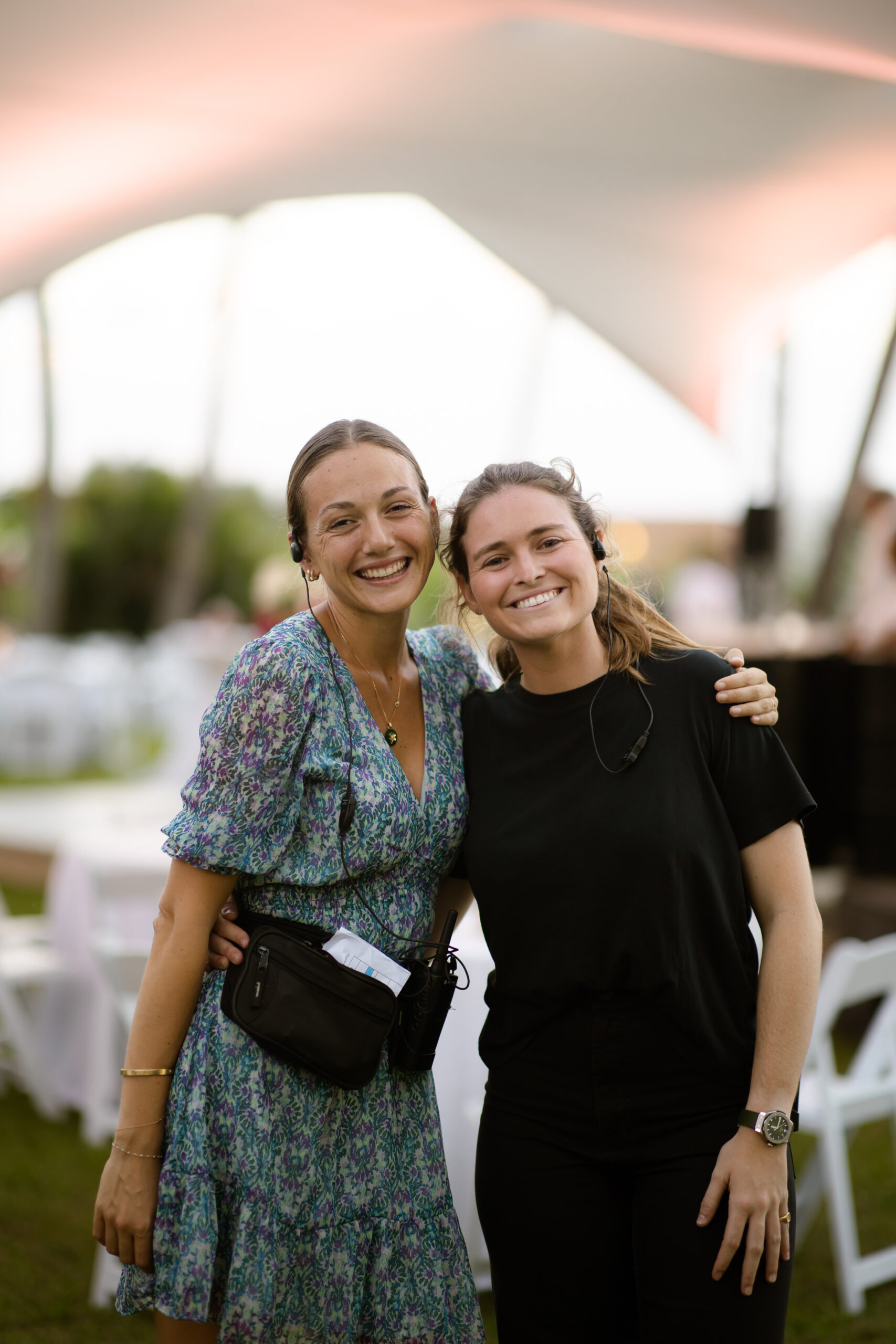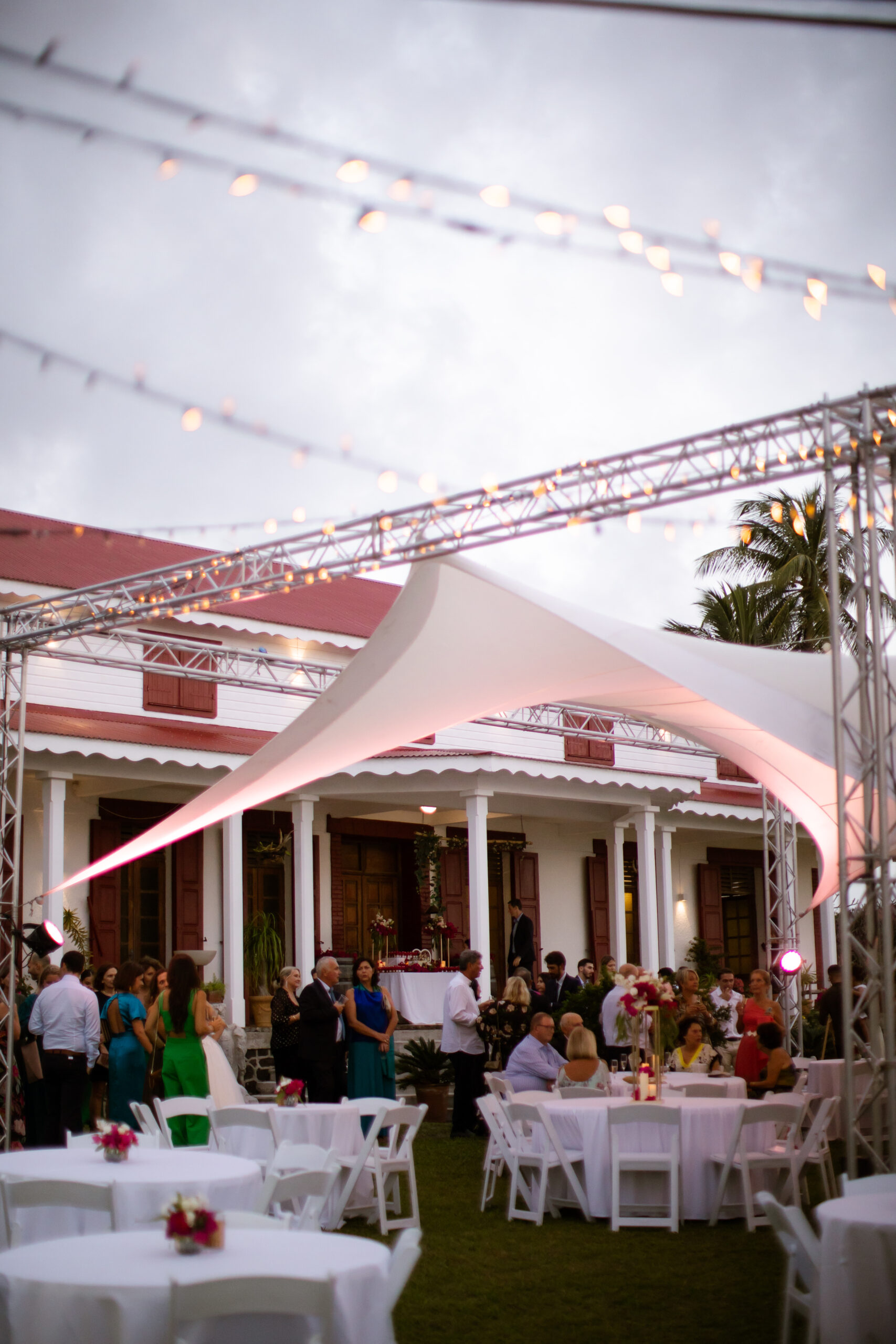 - Plusieurs chapiteaux aux toiles blanches, répartis entre les zones de réception, les espaces techniques, le bar et les buffets ;