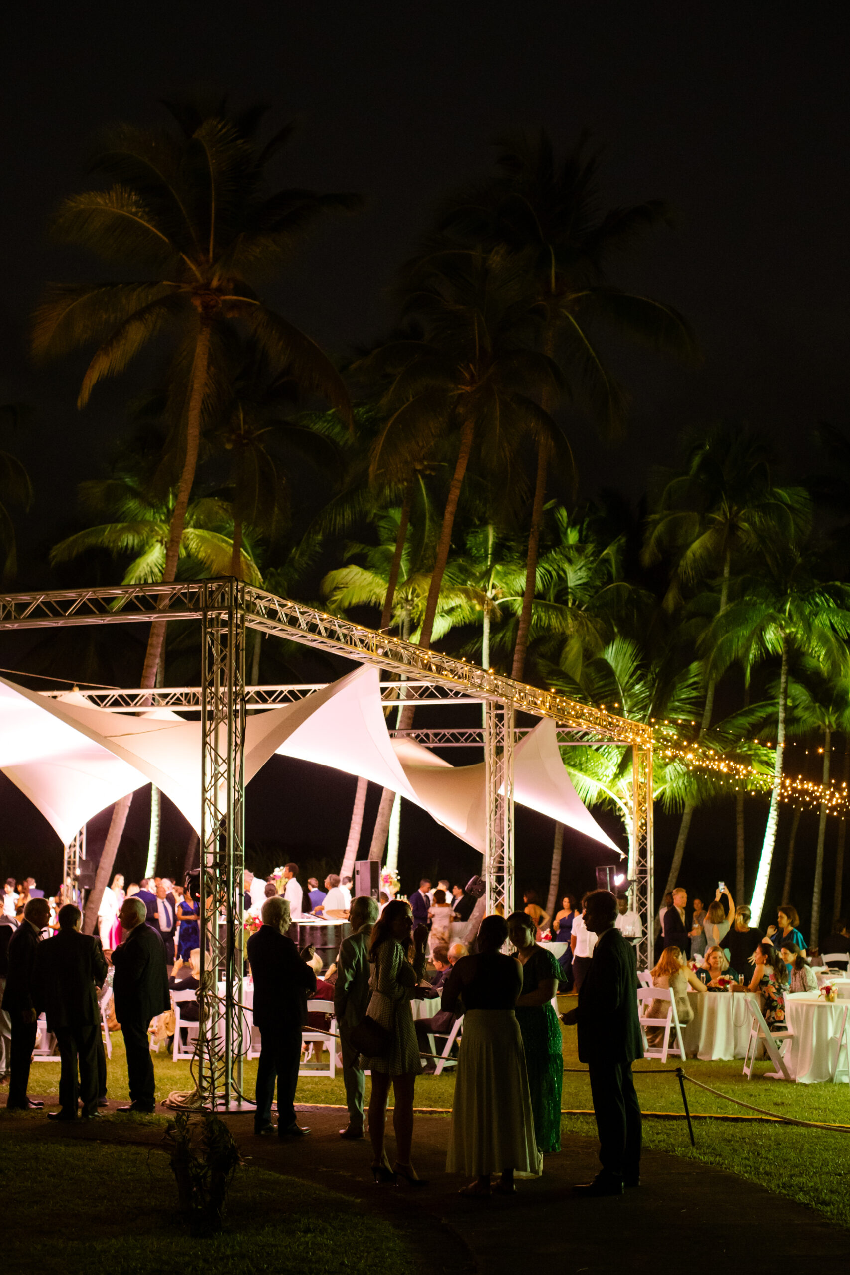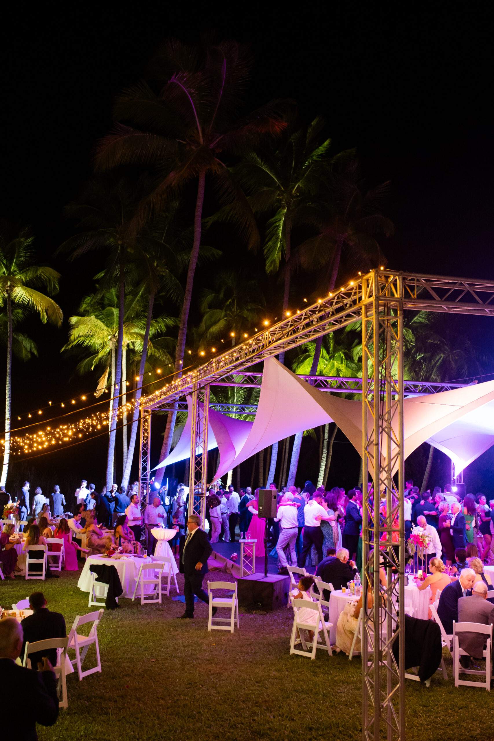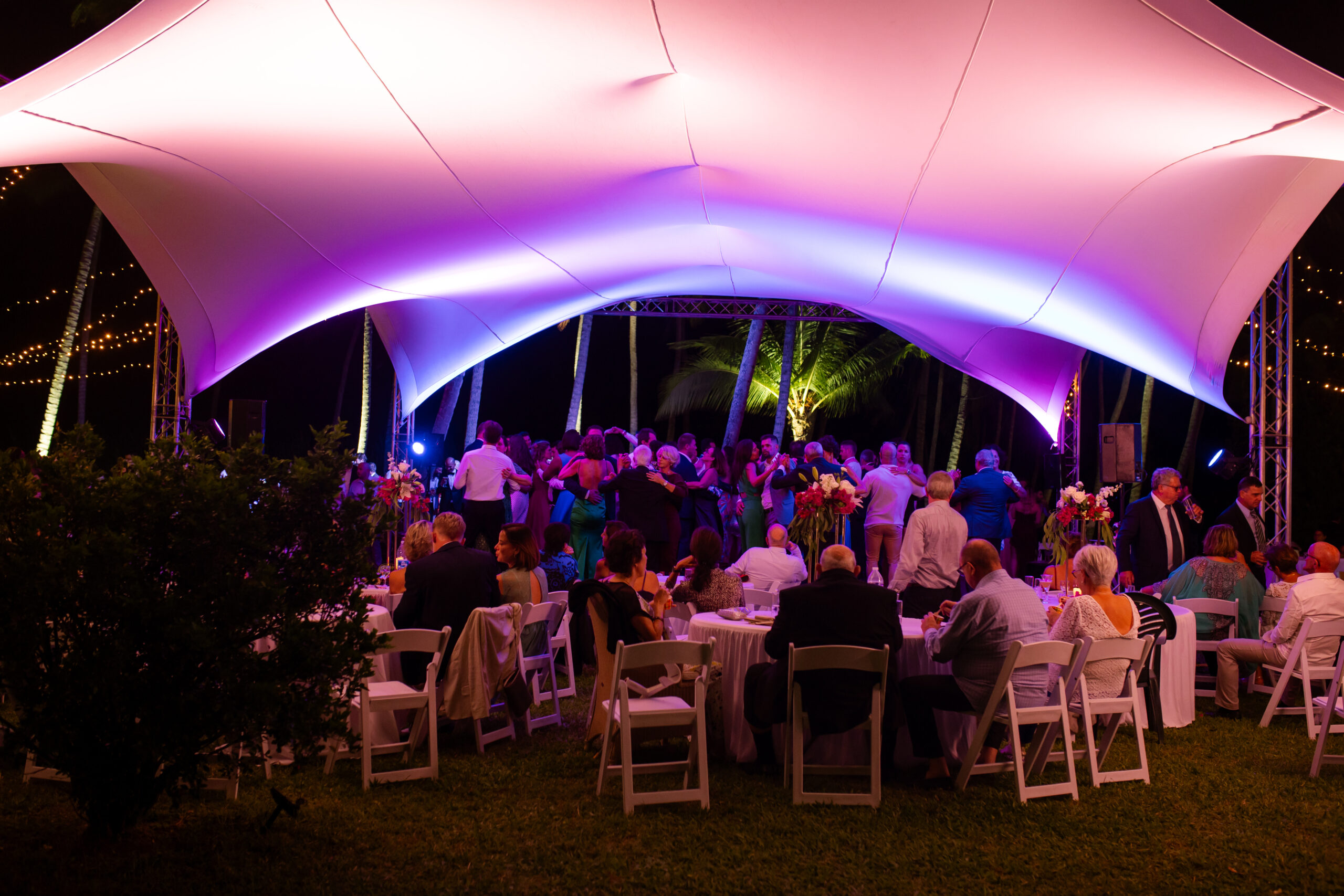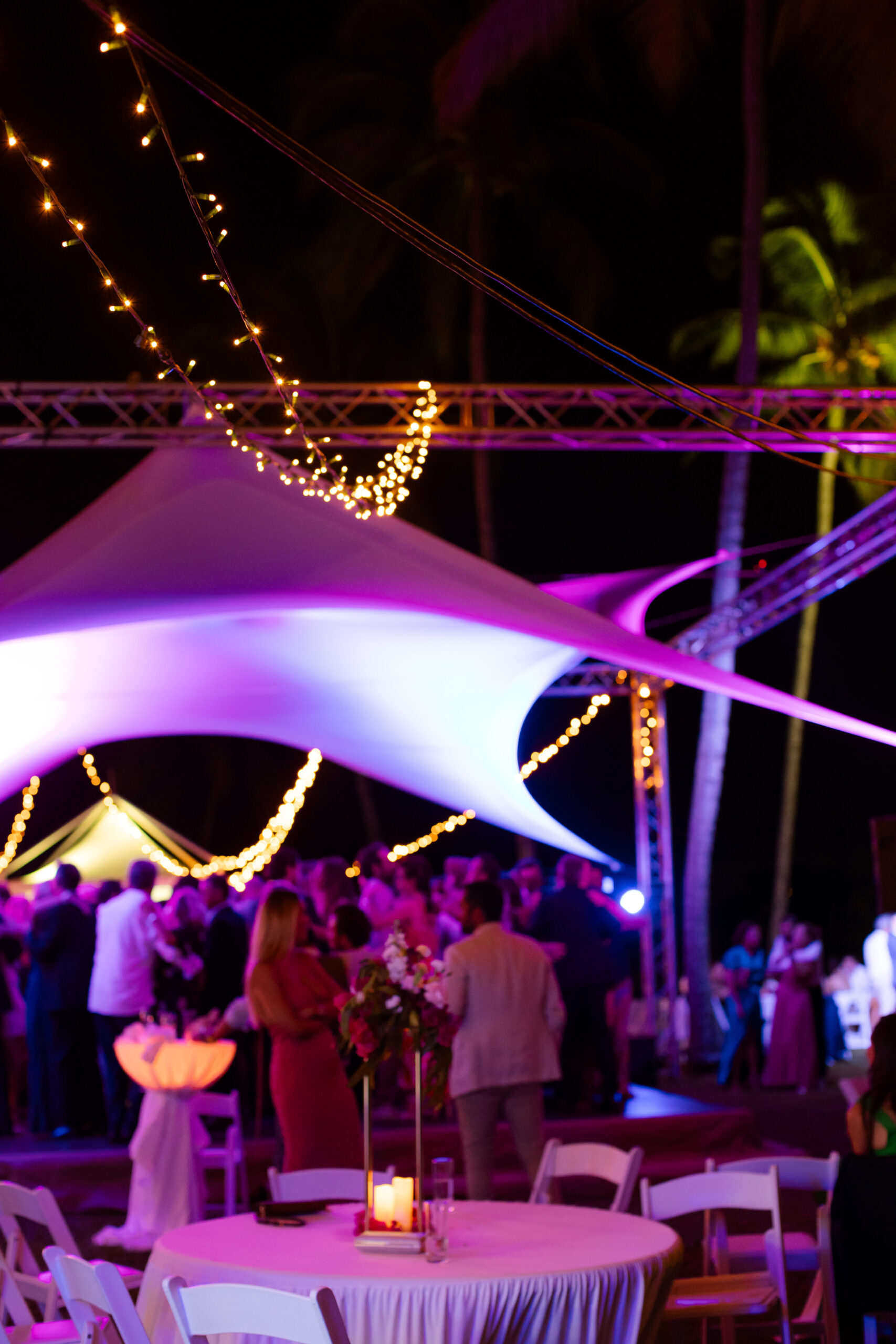 Des projecteurs type PAR à LED outdoor, des guirlandes lumineuses blanc chaud et des éclairages décoratifs type guirlandes guinguettes ont permis de créer une ambiance élégante et chaleureuse pour les espaces de réception.